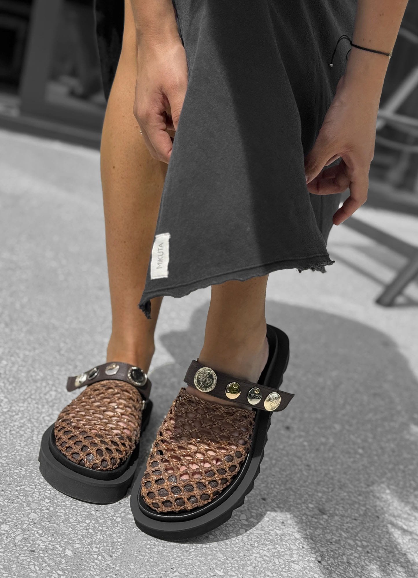 Step into style with this unique slip-on design, crafted from natural leather and breathable mesh.
