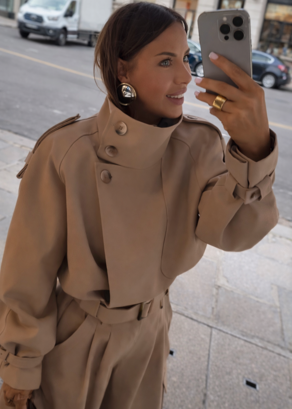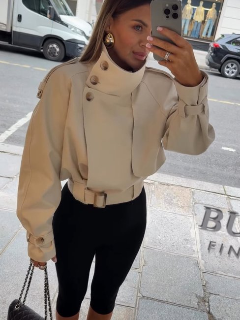 A stylish jacket with a fashionable oversized cut and a high stand-up collar that adds character and protects against the cold.
