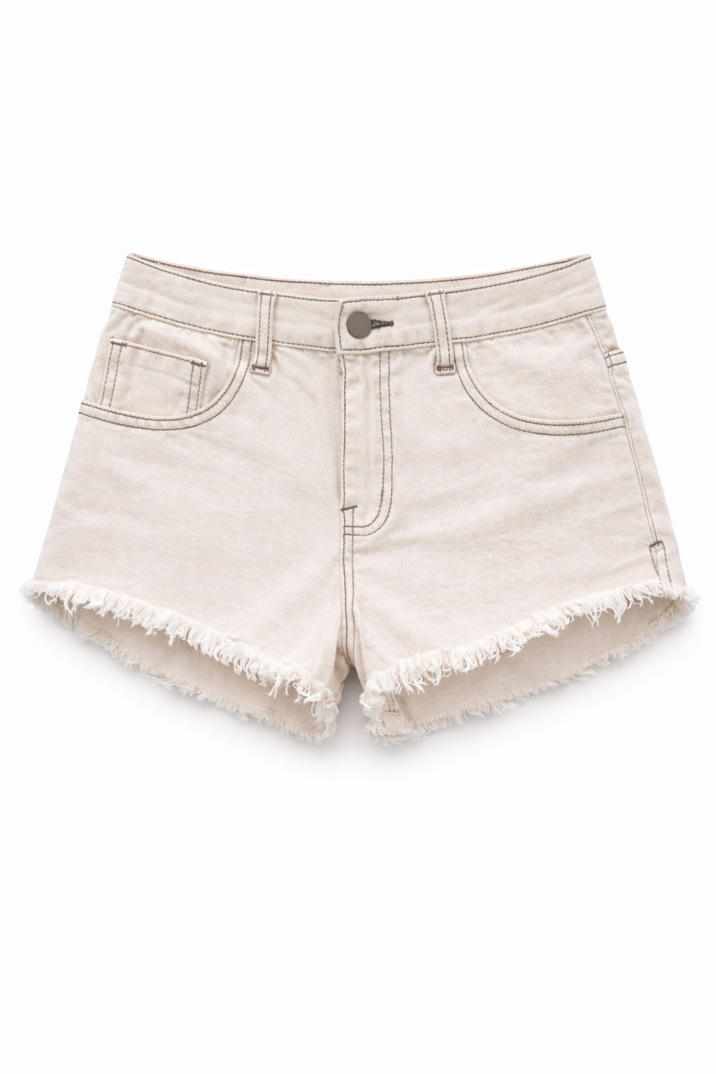 The design includes front and back pockets, belt loops, and a button fastening, making them both practical and versatile. The raw frayed hem adds a modern, slightly edgy touch that makes these shorts perfect for summer outfits and everyday wear.