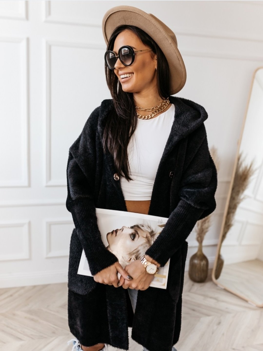 Introducing the beautiful black coat-cardigan from the renowned Polish brand, COCOMORE. Its incredibly soft, pleasant-to-the-touch fabric (often called ‘alpaca style’) will keep you warm on cooler days, while the relaxed, loose fit guarantees maximum comfort and a flattering silhouette.