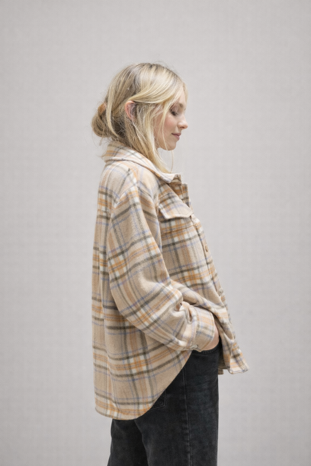 Designed with a classic collar, button-front fastening and practical chest pockets, the shacket features a timeless check pattern in warm, neutral tones. The slightly oversized fit allows for comfortable layering, making it an ideal transitional piece for the cooler seasons.
