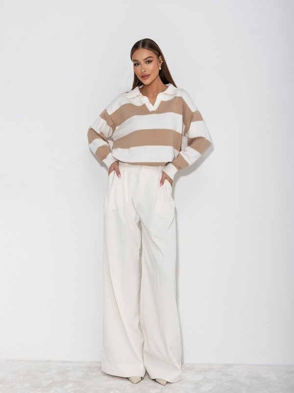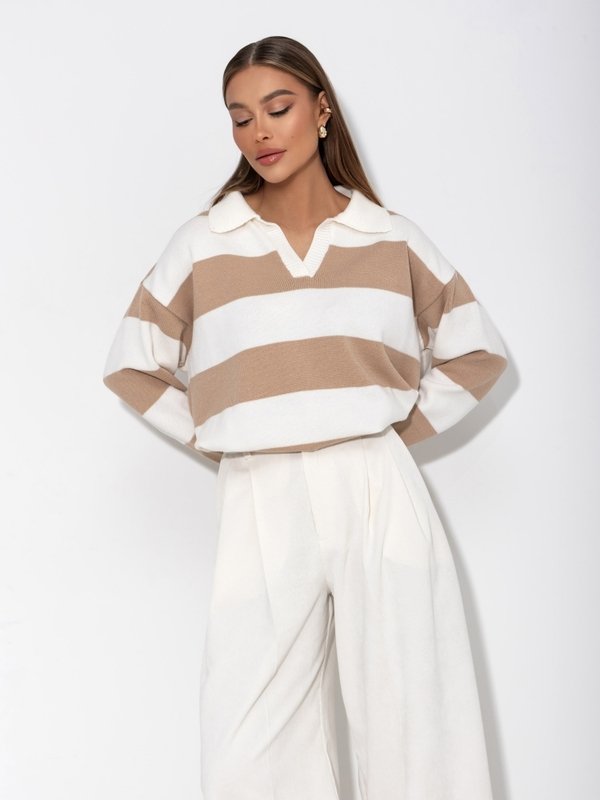 The Ernie sweater is an elegant and comfortable V-neck sweater with a wide collar that falls over the shoulders,
