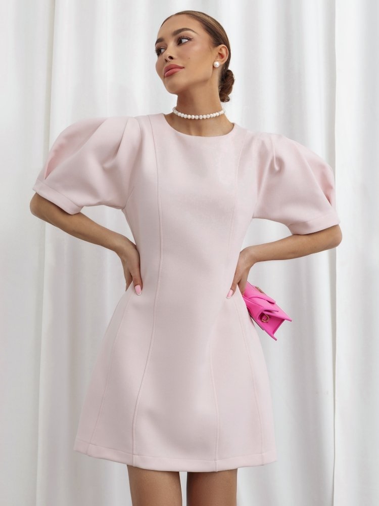 Its exceptional charm comes from the vertical seams and puff sleeves.