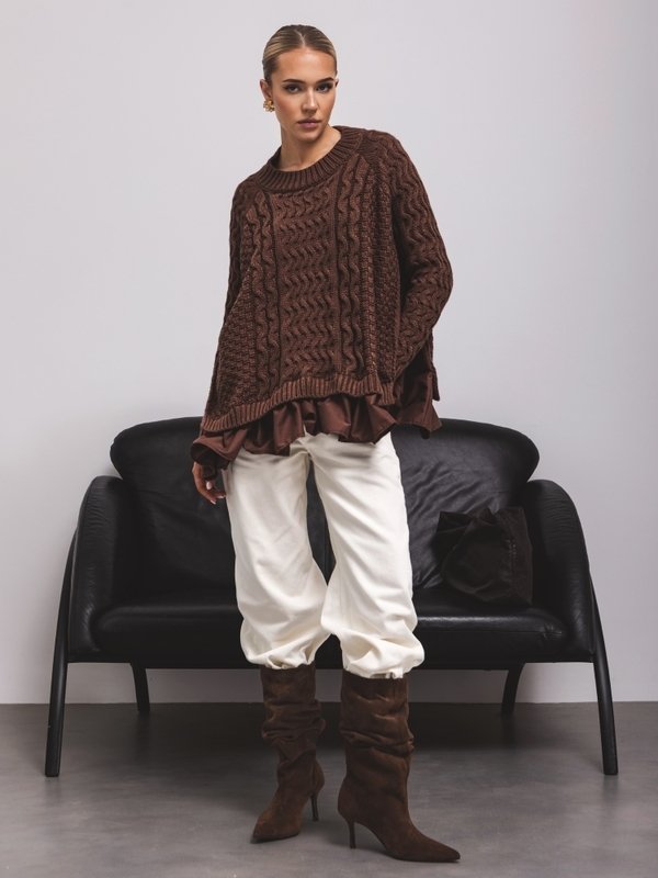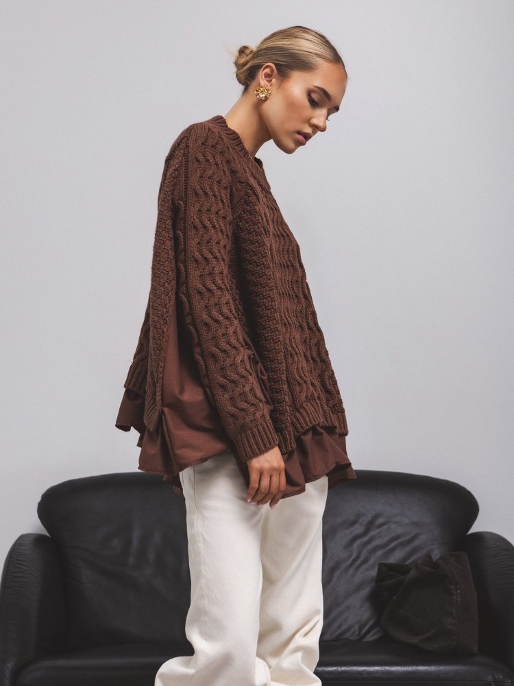 The Tulula sweater in an oversized silhouette combines timeless elegance with a modern edge. Crafted from beautifully textured cable-knit yarn on both the front and back, it stands out with its refined detailing. A distinctive feature is the subtly flared hem finished with lightweight nylon accents, adding a contemporary touch to the classic knit. Perfect for elevating autumn and winter looks.