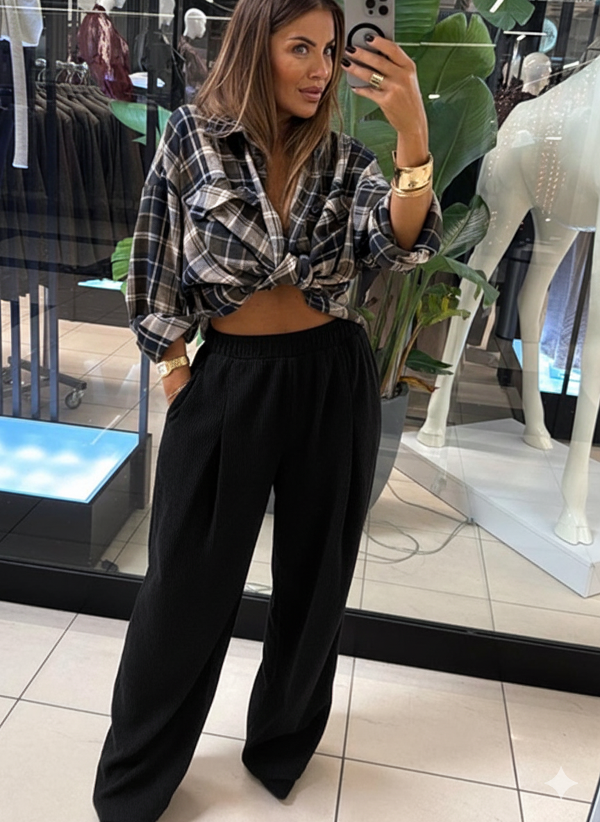 Our oversize corduroy trousers are this season’s must-have for women who value comfort, modern ease, and a stylish everyday look. Made from soft, pleasant-to-touch fabric, they offer exceptional comfort throughout the day. The relaxed, loose silhouette drapes beautifully on the body, creating a chic and effortless vibe.