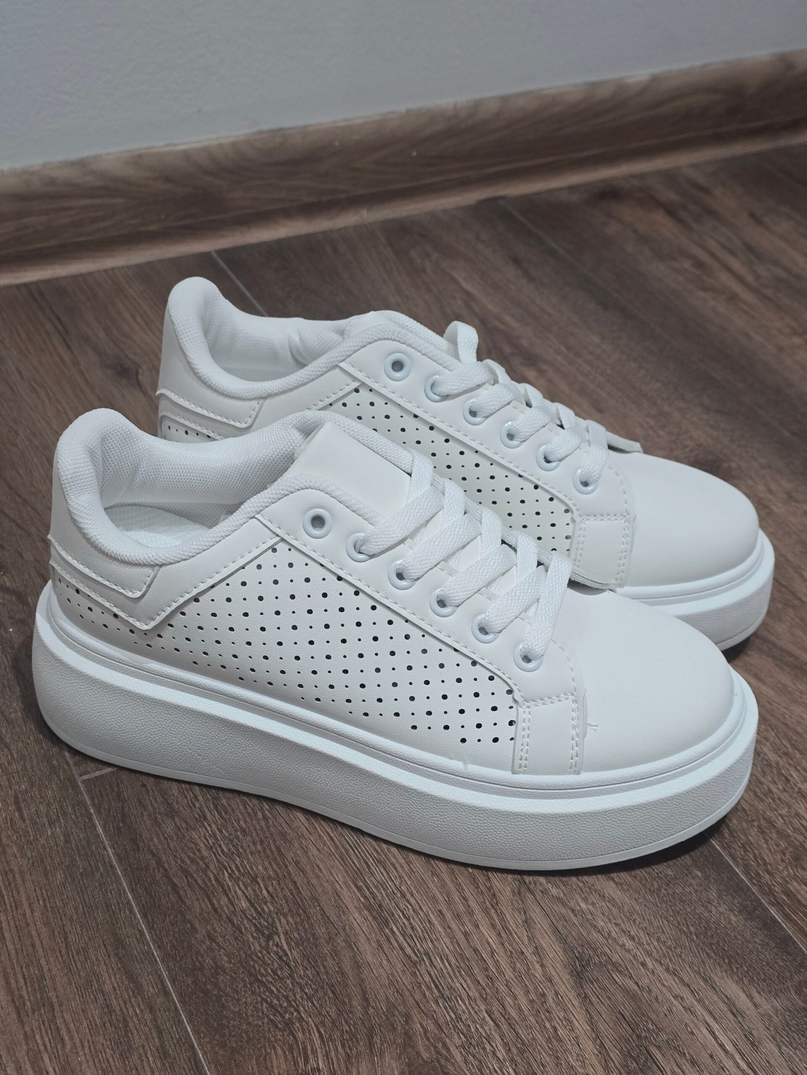 Timeless white sneakers crafted from high-quality eco-leather, designed to complement both casual and elevated everyday looks. Their clean silhouette and minimalist finish make them a versatile wardrobe essential, perfect for pairing with dresses, tailored trousers, or relaxed denim.