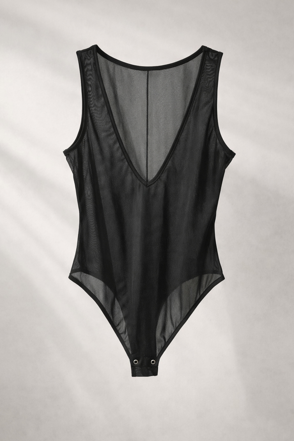A sensual mesh bodysuit from EMO, designed to elevate modern, confident styling. Made from lightweight, semi-sheer mesh fabric, it softly contours the body while adding a subtle, alluring transparency. The deep V-neckline enhances the feminine silhouette, while the sleeveless cut keeps the design sleek and contemporary.