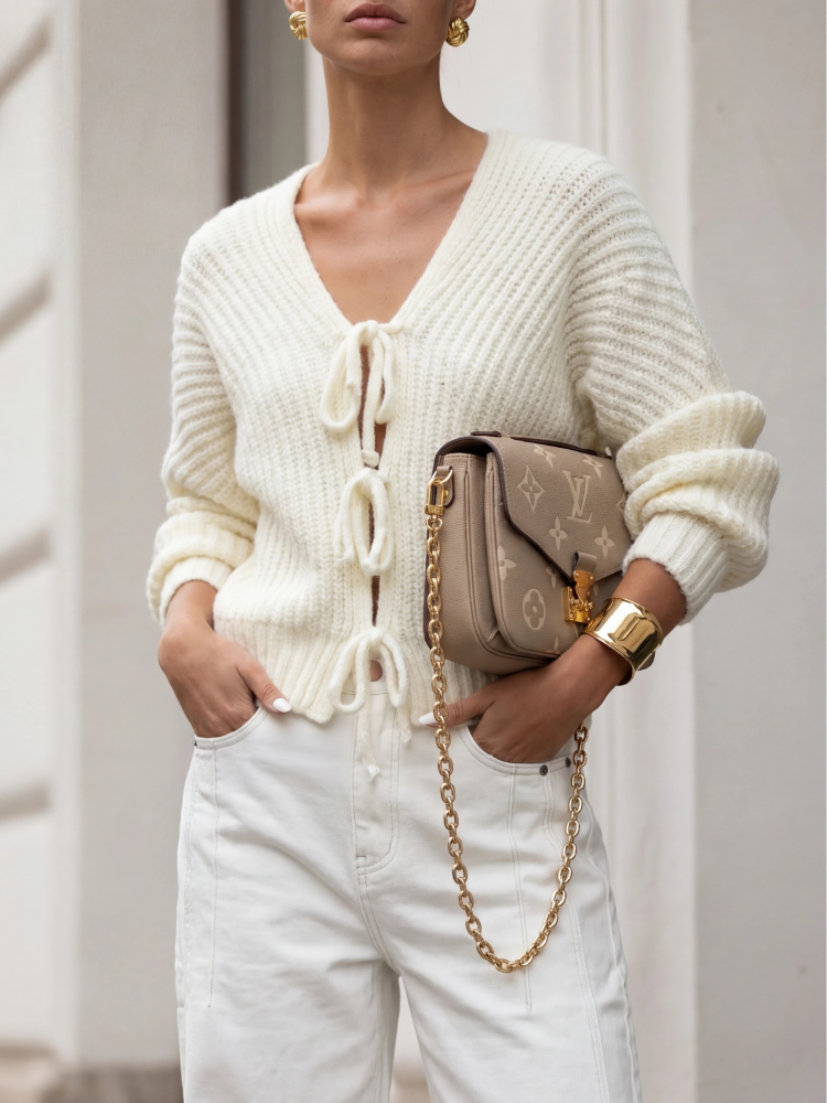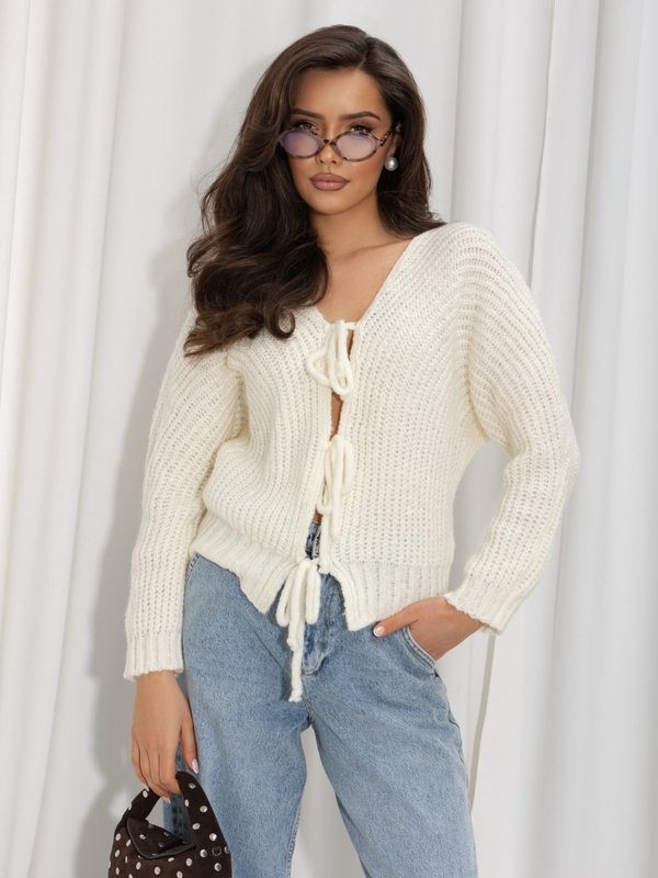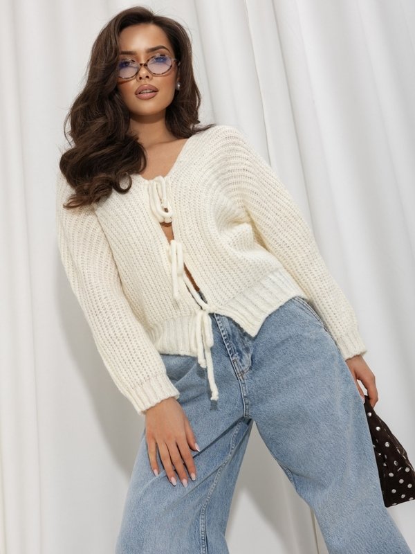 The Grover sweater is a timeless, cropped design adorned with ties at the front. Its feminine V-neckline and ribbed trims accentuate your figure. It’s a perfect addition to any outfit this coming season.