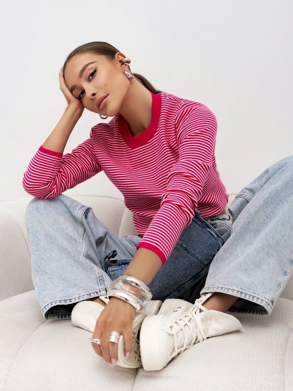 The timeless Ivans sweater with a striped print is a great alternative to classic blouses. Ribbed cuffs ensure a perfect fit. A subtle manufacturer’s logo on the side completes the look.