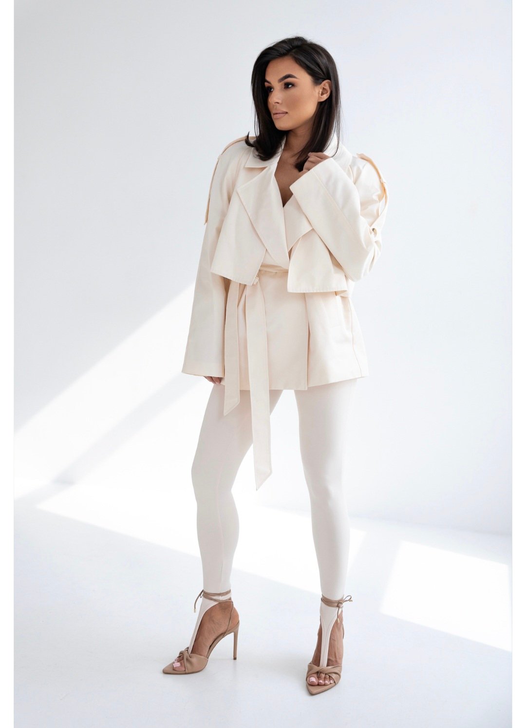 Kate’s short trench is a modern interpretation of a classic – minimalist yet distinctive. It sits perfectly on the silhouette thanks to its slightly oversize cut and waist tie, which subtly emphasises proportions. Made from 60% cotton, it provides a comfortable and breathable feel, ideal for the transitional season. The cropped shape adds a light and modern touch to the styling, pairing well with both classic trousers and more casual ensembles.