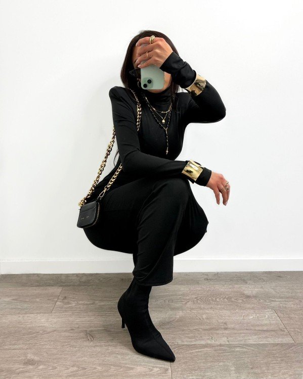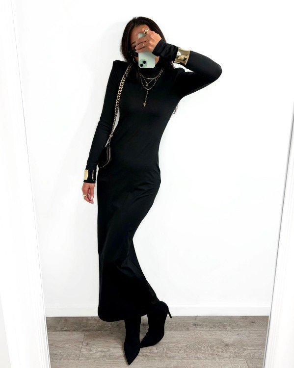 An elegant, fitted maxi dress with a turtleneck. The deep black colour and smooth, high-quality fabric give the dress a luxurious look. Perfect with black boots or stilettos, it also works well in a more edgy version with heavy boots and a leather biker jacket.