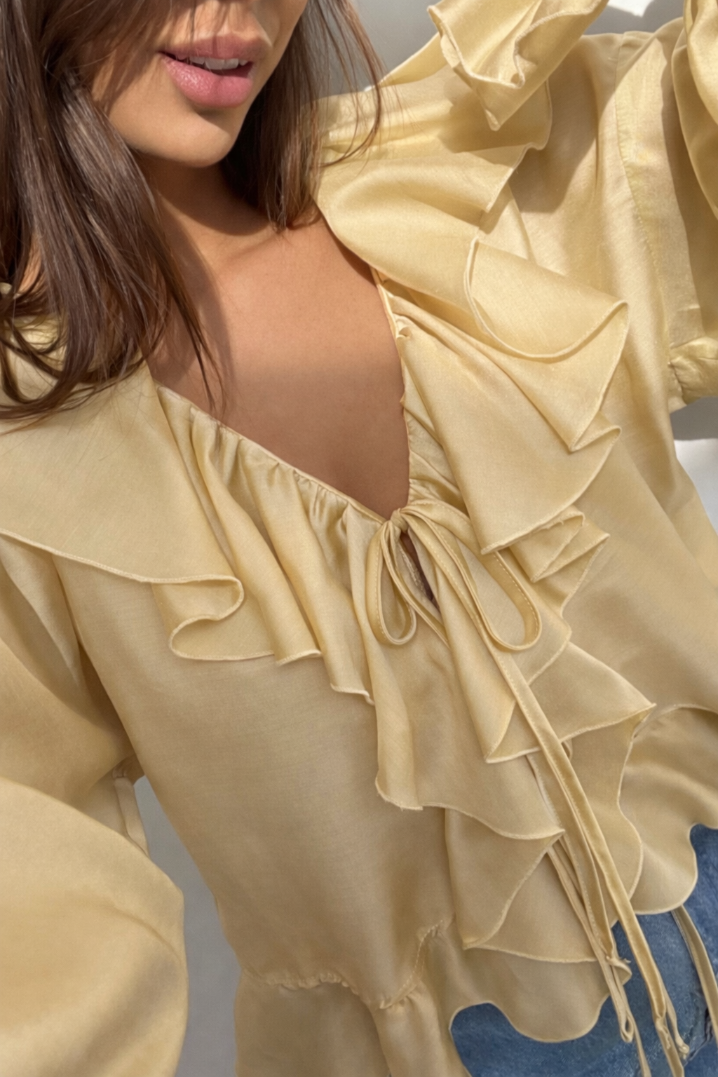 This striking shirt with large ruffles at the neckline draws attention and adds a romantic touch to any outfit.