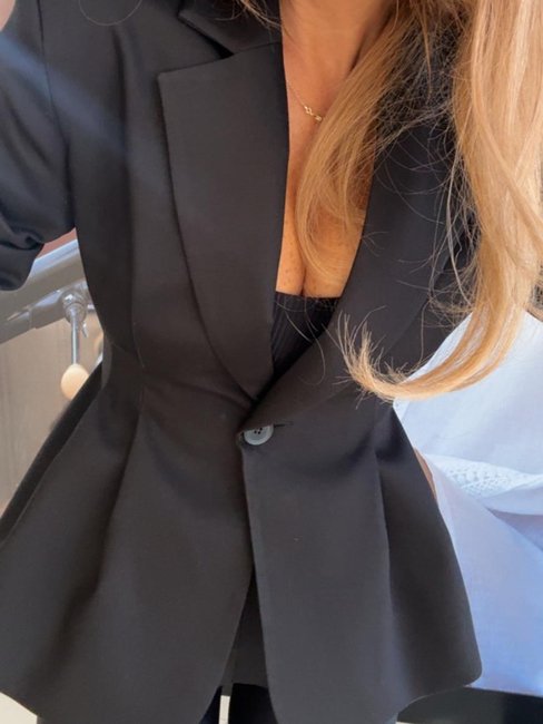 This tailored jacket fastens with a single button and features a decorative belt at the back for added aesthetic appeal. The classic cut flatters the silhouette, combining elegance with modern style.