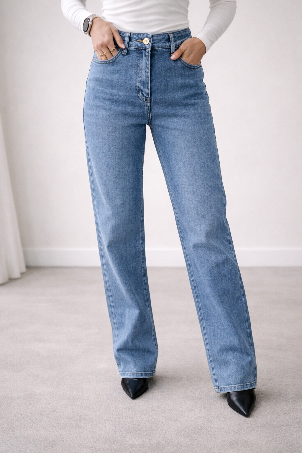 The high-waisted cut beautifully defines the waist, while the straight-leg silhouette creates a clean, elongated line. Subtle fading adds depth and character without compromising the classic aesthetic. Finished with traditional five-pocket detailing and a secure button fastening, these jeans blend modern minimalism with timeless appeal.