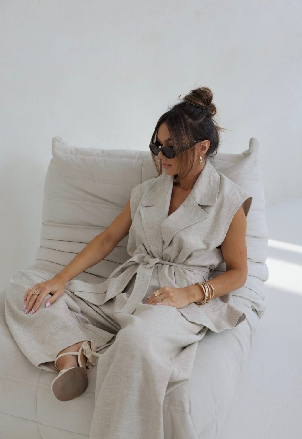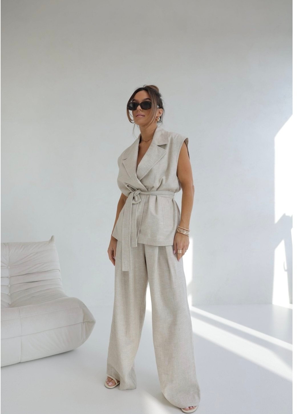 A set of vests and trousers. Elegant vest. Big flaps. Tie with a belt. Pants with a wide cut.