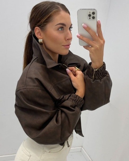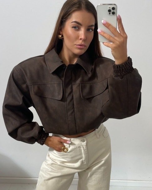 Available in a rich, on-trend shade of earthy brown or chocolate, the “Mat” jacket is a versatile piece that will elevate any outfit.