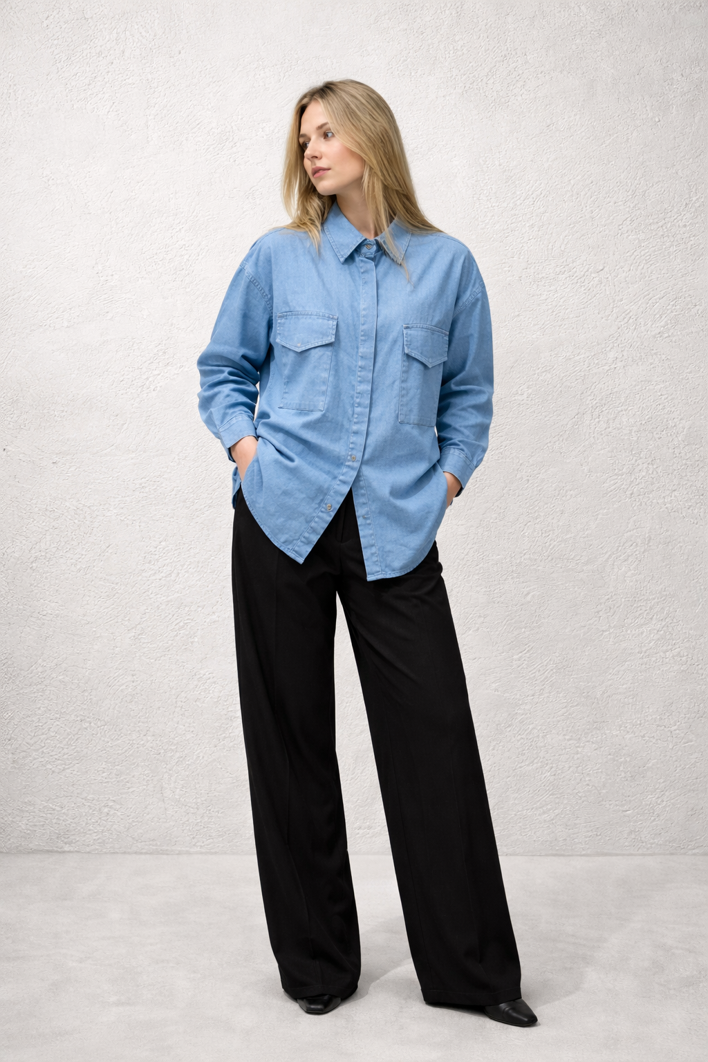 An oversized shirt with a relaxed, modern silhouette, made from soft, breathable fabric with a smooth finish. Featuring a classic collar, concealed front buttons, and practical chest pockets, this design combines comfort with timeless style. The loose fit allows for effortless layering and gives the piece a contemporary, minimalist character.