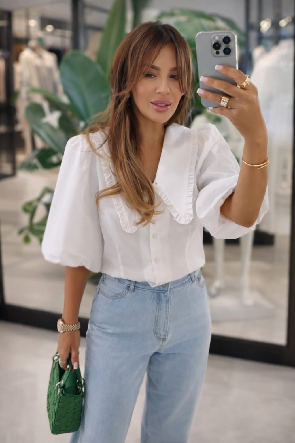 A girly shirt with a large collar and puff sleeves that adds a unique, fashionable touch to any outfit. Lightweight and incredibly flattering, it’s perfect for creating a sweet yet stylish look.