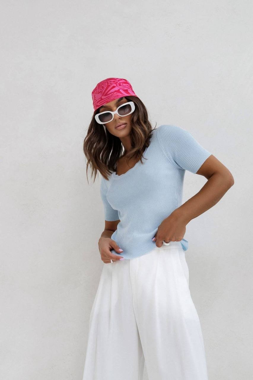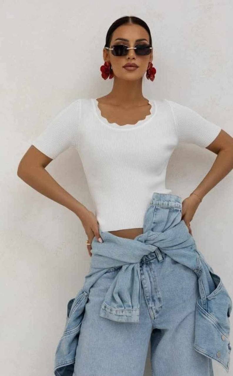 A ribbed blouse with short sleeves and a decorative, wavy neckline. The fitted cut perfectly emphasizes the figure. A great base for everyday and more stylish sets.