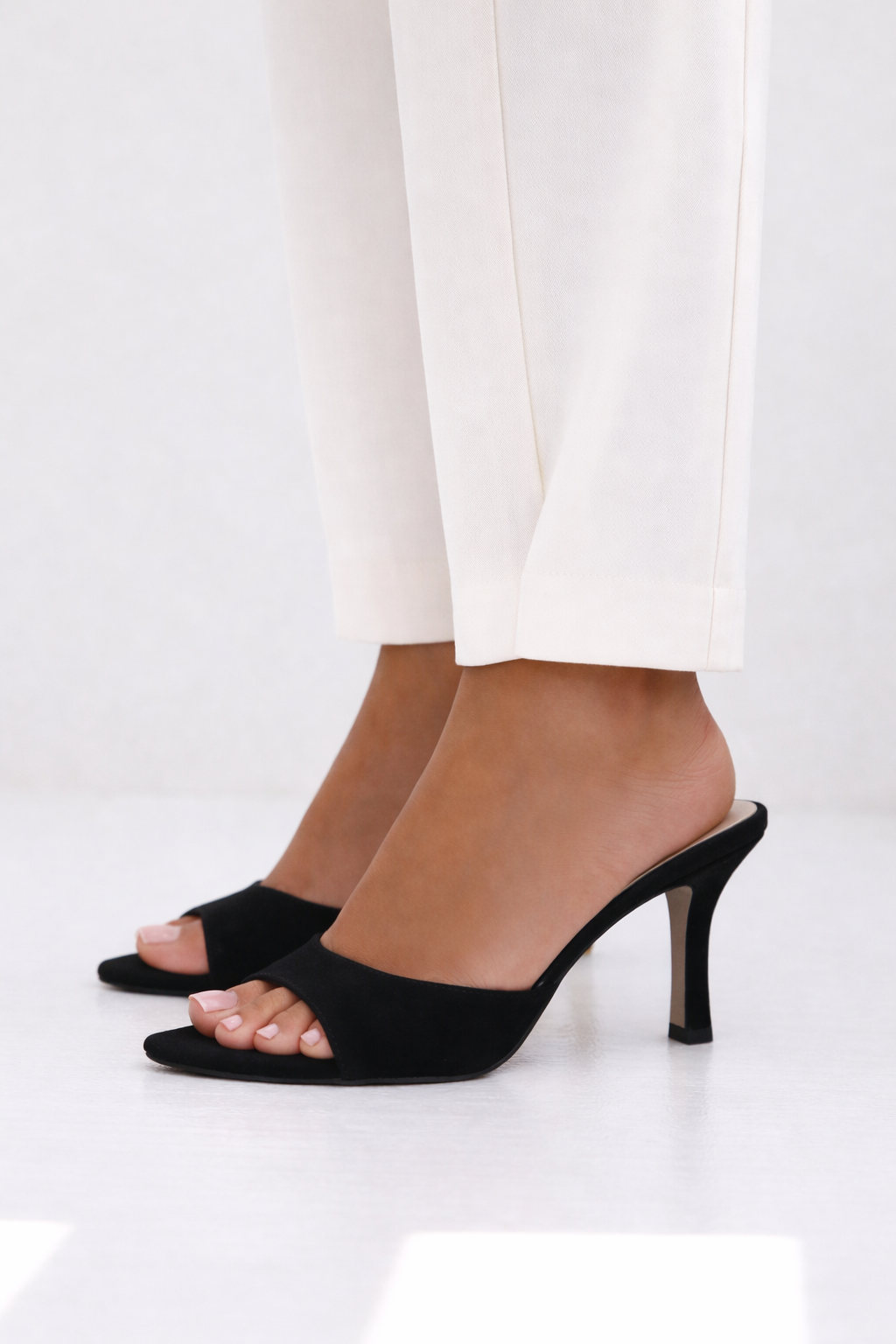 Perfect for both day and evening styling, these suede leather mule heels pair seamlessly with dresses, tailored trousers or skirts, making them a versatile addition to a contemporary wardrobe.