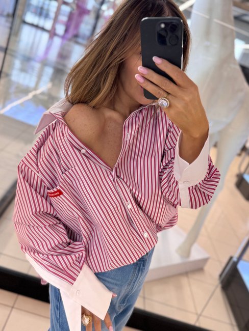 A smart pink striped shirt with white cuffs and a stunning finish. A stylish accent in the form of a red patch on the pocket adds a unique touch.