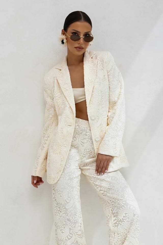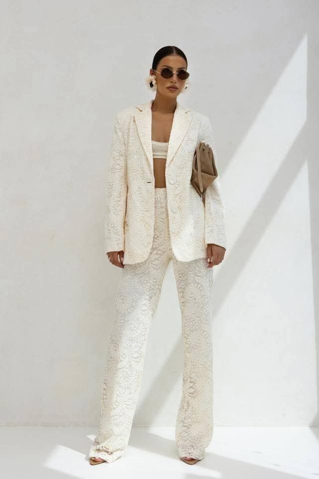 Introducing the exquisite new Cocomore collection, featuring a stunning two-piece set of a delicate lace jacket and elegantly tailored lace trousers. This ensemble is the perfect choice for a variety of special occasions on your horizon. Crafted with your comfort in mind, the entire set is fully lined, ensuring a wonderfully cozy and pleasant feel against your skin.