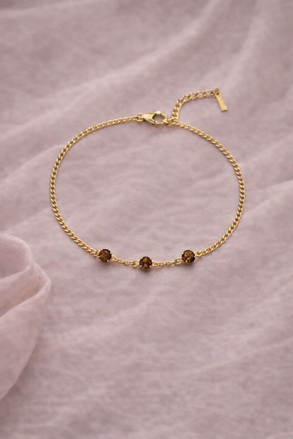 Elegant and refined, this delicate bracelet by Colibra is a beautiful example of timeless jewelry design. The piece features a fine gold-tone chain adorned with three carefully set brown zirconia stones, which add a warm sparkle and subtle sophistication to the bracelet.