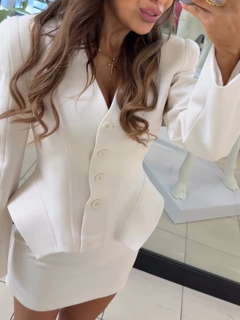 An elegant set consisting of a stylish jacket and short skirt, perfect for special occasions and everyday wear.