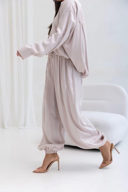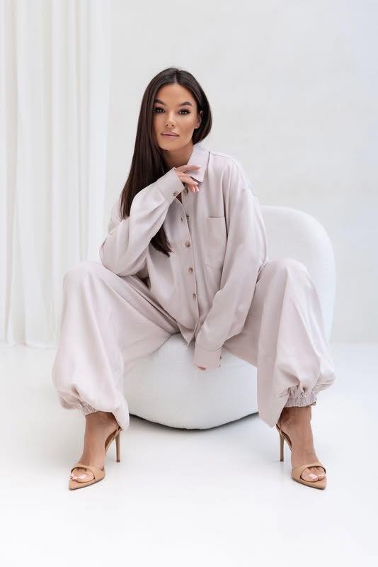 A stylish set consisting of a loose, oversized shirt with a relaxed fit and an elastic waistband that gently shapes the figure, and wide, long trousers made of flowing fabric, ensuring complete comfort and elegance in everyday wear.