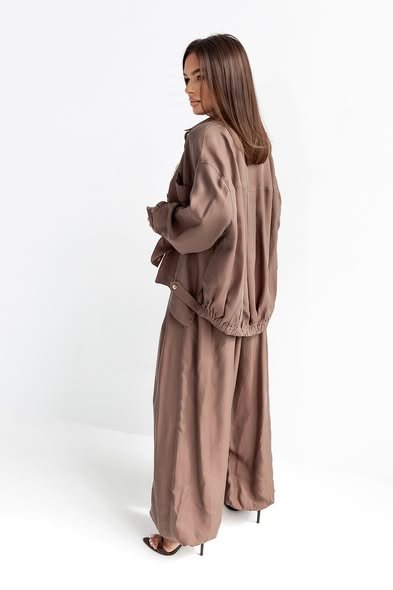 A stylish set consisting of a loose, oversized shirt with a relaxed fit and an elastic waistband that gently shapes the figure, and wide, long trousers made of flowing fabric, ensuring complete comfort and elegance in everyday wear.