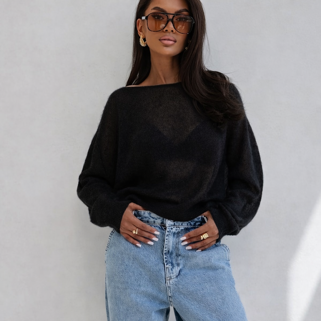 Light, breathable Premium sweater guarantees a “soft cloud” effect and luxurious softness. Its loose, boxy cut and slightly shorter length pair perfectly with high-waisted jeans, skirts or elegant trousers, while the wide boat neckline adds feminine charm to the overall look.