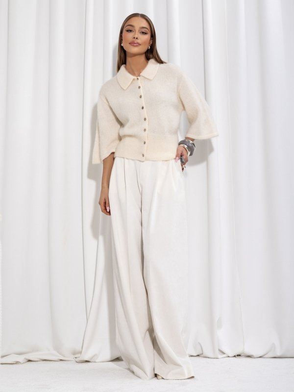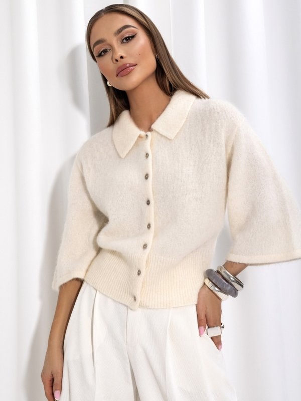 Fantastic Deryl sweater, made from premium-quality yarn. Fastened with wooden buttons, which allows it to be styled and worn in many different ways. The design is finished with a wide ribbed hem and 3/4 length sleeves.